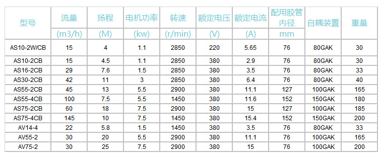 AS、AV型撕裂式潛污泵型號參數(shù)